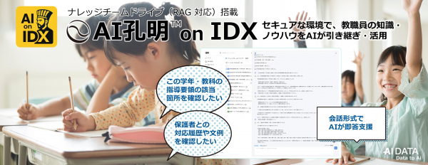 企業データとAIの利活用カンパニー、AIデータ株式会社(本社:東京都港区、代表取締役社長 佐々木隆仁、以下AIデータ社)は、教育機関向けの次世代業務支援ソリューションとして、生成AI × 教育ナレッジ活用型プラットフォーム「AI孔明 on IDX」に、教育業界向けナレッジチームドライブ(ナレッジRAG Readyドライブ)を搭載した新バージョンの提供を開始いたします。