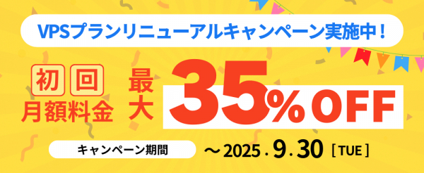 →上記サービスの「VPS25-12Gプラン」をお申込みいただくと初回月額料金が35%OFFに!
