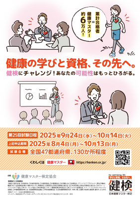 第25回日本健康マスター検定の受検申込は8月4日(月)~10月13日(月)、「合否即時発表」「期間内同一コース再受験可能」として全国47都道府県125CBT試験会場(予定)にて開催します。試験期間は9月24日(水)~10月14日(火)、再受験を希望する場合は試験翌日9時までにマイページにアップされた合否結果を確認して申し込むと、最短試験日の翌々日より再受験が可能となります。第20回検定より新テキスト(健康日本21・第3次対応 https://kenken.or.jp/student/text)準拠に切替わり、健康マスターコースは「100年ヘルスケアバイブルI(健康マスター版)」、エキスパート健康マスターコースは「100年ヘルスケアバイブルI(健康マスター版)」「100年ヘルスケアバイブルII(エキスパート版)」2冊の学習が必要になります。