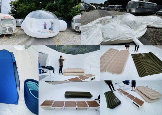 そして、2024年10月に国際宇宙会議(IAC 2024)で国際論文として発表した「日本におけるASTRAX月面シティ模擬施設の構築2024」に則って、月面基地模擬施設の共同活動エリアである部分をエアドーム、エアベッド、折りたたみ式テーブル、エアバスタブ、簡易トイレ、バッテリー、収納ボックスを用いて組み立てを行いました。またエアドーム内の温度と気圧確認のため、日本の真夏の気候の中で1日設置する実験を行いました。同時に、空間的に最大6名まで滞在可能であることを確認しました。