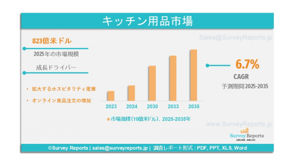 Survey Reports LLCは、2025年8月に調査報告書『キッチン用品市場のセグメンテーション:素材別(ガラス、ステンレス鋼、セラミック、木材、プラスチック、その他)、タイプ別(調理器具、焼き器具、カトラリー、食器、その他)、用途別(家庭用、業務用)、流通チャネル別(オンライン/EC、オフライン)-世界市場分析、動向、機会および予測、2025~2035年』を発表したと公表した。本報告書は、キッチン用品市場に関する予測評価を提供しており、成長要因、市場機会、課題、脅威といった主要な市場ダイナミクスを明らかにしている。