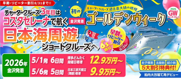 クルーズ予約サイト「ベストワンクルーズ」運営の株式会社ベストワンドットコム(本社:東京都新宿区、代表取締役:澤田秀太、野本洋平)は、2026年ゴールデンウィークにチャーターするコスタセレーナ金沢発着クルーズの早割・リピーター割受付期間を8/31(日)までに延長いたしました。