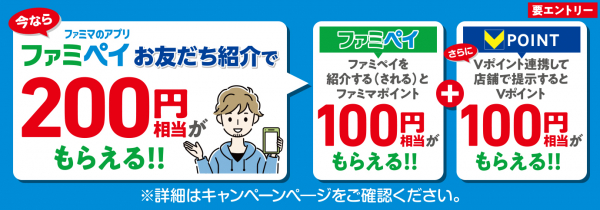 期間中、紹介する方が「ファミペイ」からお友だち紹介コード(ギフトコード)を送付し、紹介された方が新規会員登録後、紹介コードを入力し、ファミリーマート店舗でファミペイバーコードを提示してお買い物すると、紹介した方、された方どちらも100円相当のファミマポイントがもらえます。さらに同期間中、紹介した方、された方どちらもファミリーマート店舗でVポイント連携したファミペイバーコードを提示してお買い物をすると、100円相当のVポイントがもらえます。紹介人数に制限が無い為、紹介した分だけポイントがもらえます(要エントリー)。