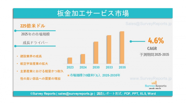 Surveyreportsの専門家による分析によれば、2025年における板金加工サービス市場の規模は225億ドル(USD 22.5 Billion)であった。また、2035年末には359億ドル(USD 35.9 Billion)に達すると予測されている。2025年から2035年の予測期間中の年平均成長率(CAGR)は約4.6%と見込まれている。