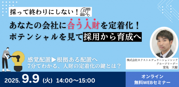 科学的なデジタル技術を駆使して、企業人財のスキル・コンピテンシーアセスメント、教育研修、組織人財分析コンサル専門の教育サービスベンチャーの株式会社ネクストエデュケーションシンク(略称:NET)(本社:東京都文京区、代表取締役:斉藤実)は、企業が本当に必要とする“自社に合う人財”を採用時から見極め、配属・定着・育成へと導く一貫した仕組みづくりをテーマにした実践型セミナーを2025年9月9日にオンライン開催します。