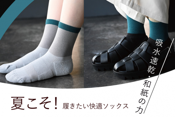 蒸れやすい足部分には吸湿速乾性のある和紙糸を使用し、ドライ感がありながらもクッション性のある履き心地を実現。くるぶしから上は、和紙の肌あたりで痒みや不快感が出ないよう、オーガニックコットンを使用することでやさしい履き心地のソックスに仕上げました。また、裏糸には「ライクラファイバー」という、ポリウレタン繊維によってニオイが吸収される消臭機能付きの糸を採用し、TO&FROとPESCALLYのコラボレーションだからできる機能性を追求しています。