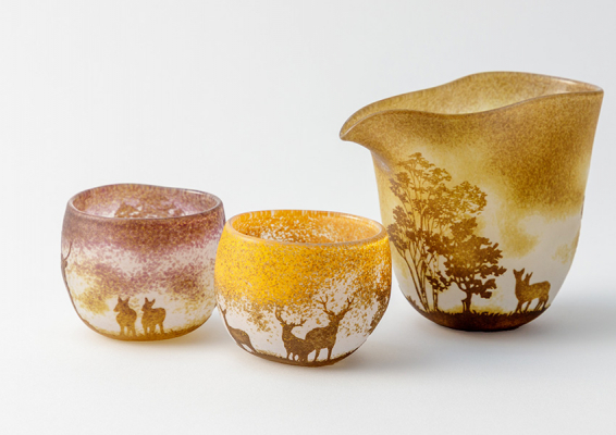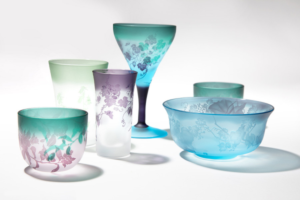 繊細でおぼろげな風合いの中に、透き通るような色合いが美しい、北島雅子さん・陽子さんのテーブルウェア。サンドブラスト技法で製作された硝子の器は、これからの夏を涼やかに彩ってくれることでしょう。