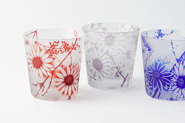 サンドブラストとは、硬くて細かい砂(金剛砂など)を高圧で吹き付けガラスなど素材の表面を削り取ることでデザインを表現する技法。もとは工業用の錆落としとして1870年アメリカで開発され、当時はショットブラストと呼ばれ、20世紀に入って美術工芸用として改良されたのがサンドブラストです。日本には明治末頃に入ってきました。
