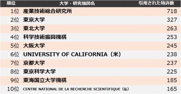 3位 東北大学の最も引用された特許は、JFEスチールと共同保有の「高生産性で低コストの還元鉄を製造する方法」に関する技術で、住友金属鉱山の計6件の審査過程において拒絶理由として引用されています。
