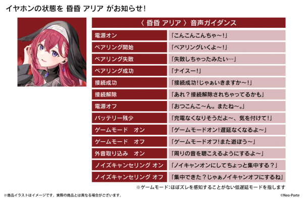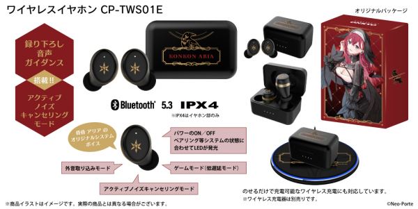 本モデルは、昏昏アリアの録り下ろし音声ガイダンス(全13ワード)を搭載。充電ケースの天面とイヤホン本体には昏々アリアをイメージしたデザインをあしらい、パッケージには本モデルのために描き下ろされたイラストを採用しております。