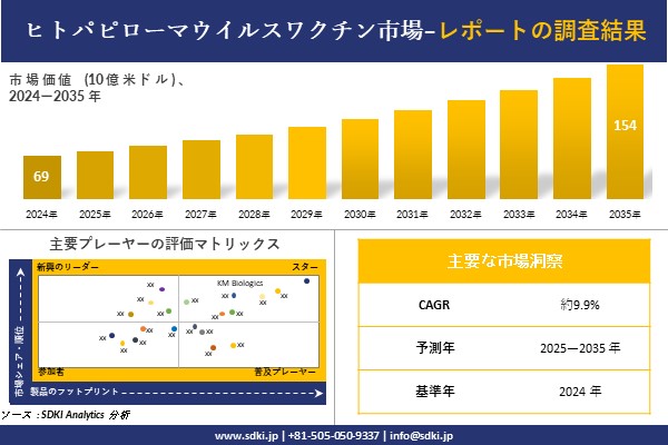 SDKI Analytics(本社:東京都渋谷区)は、このたび、2025年08月06に「ヒトパピローマウイルスワクチン市場調査レポート:2025-2035年の市場規模、シェア、傾向の予測」を発表しました。ヒトパピローマウイルスワクチンに関する市場調査レポートには、統計的及び分析的アプローチを使用した予測評価が含まれています。この調査レポートでは、一次及び二次調査方法を使用して分析された主要な業界洞察を通じて将来の傾向を理解できるようにすることで、主要な市場動向を読者に説明しています。