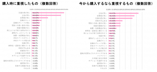 今回実施した調査によると、新築マンションの選定基準として、「交通の便が良い」「立地が良い」ことが重視されていることがわかった。さらに、実際に新築マンションに入居した後、今から購入するなら重視する項目として、「収納が沢山ある」の割合が急増した。この結果は、購入時には見落とされがちな収納スペースの重要性が、実際の生活を通じて顕在化したことを示している。子育て世帯のうち新築マンションを購入した割合では約4%にとどまり、依然として住宅購入の選択肢として現実的ではないことがうかがえる。一方、実際に購入をして、「新築マンションは必要であった」と評価した割合は約93%であった。この結果は、購入に至った世帯の多くがその選択を肯定的に受け止めており、新築マンションが子育て期の住まいとして一定の価値を持っていると認識していることを示している。デベロッパーのシェアでは、「住友不動産」や「野村不動産」がそれぞれ1割を占めるものの、「それ以外」が4割のシェアを占め、大手以外のデベロッパーも選ばれていることがわかった。子育て世帯においては、大手デベロッパーに限らず、多様な選択肢から住まいが選ばれている実態がうかがえる。