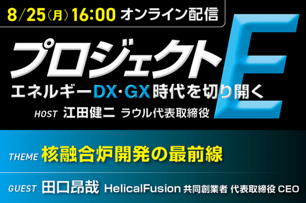 株式会社エネルギーフォーラムのオンライン番組「プロジェクトE」では、エネルギースタートアップ分野で活躍するベンチャー企業トップをゲストに招き、DX、GX、エネルギー危機などあらゆる課題が立ちはだかるニューノーマル時代のビジネス展開に迫ります。第14回のゲストはHelicalFusion 共同創業者 代表取締役CEOの田口昂哉氏です。司会は、エネルギー関連のコンサルティングや講演を行う、RAUL株式会社代表の江田健二が務めます。