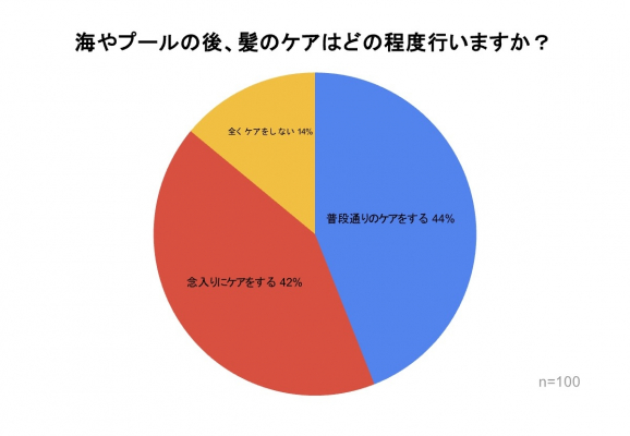 「海やプールの後、髪のケアはどの程度行いますか?」というアンケートでは、『全くケアをしない』人が14%いる一方で、『普段通りのケアをする』人が44%、『念入りにケアをする』人が42%と、ケアをする人の中では「普段通り派」と「念入り派」がほぼ半々に分かれる結果となりました。