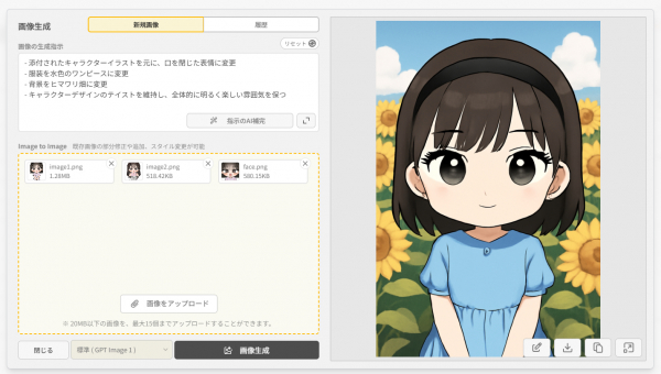 既存の画像をアップロードし、AIによる自動加工や編集が可能になりました。既存画像の色合い・タッチなどを生かした新規画像生成により、商品画像の修正、既存キャラクターの表情の変更、マーケティング素材の作成など、デザイン業務の効率化を実現します。専門的な画像編集スキルがなくても、直感的な指示でプロ品質の画像処理が行えます。