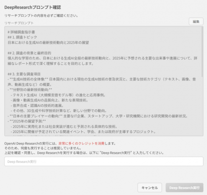 OpenAI社が提供するDeep Researchモデル「Deep Research(o3)」と「Deep Research(o4-mini)」を活用し、複雑なテーマについて、AIが多角的かつ徹底的な調査・分析を実行する機能です。市場調査、競合分析、技術トレンドの把握など、従来は時間のかかる情報収集作業を大幅に短縮できます。調査結果は構造化された形で提供され、意思決定に必要な洞察を効率的に得ることができます。