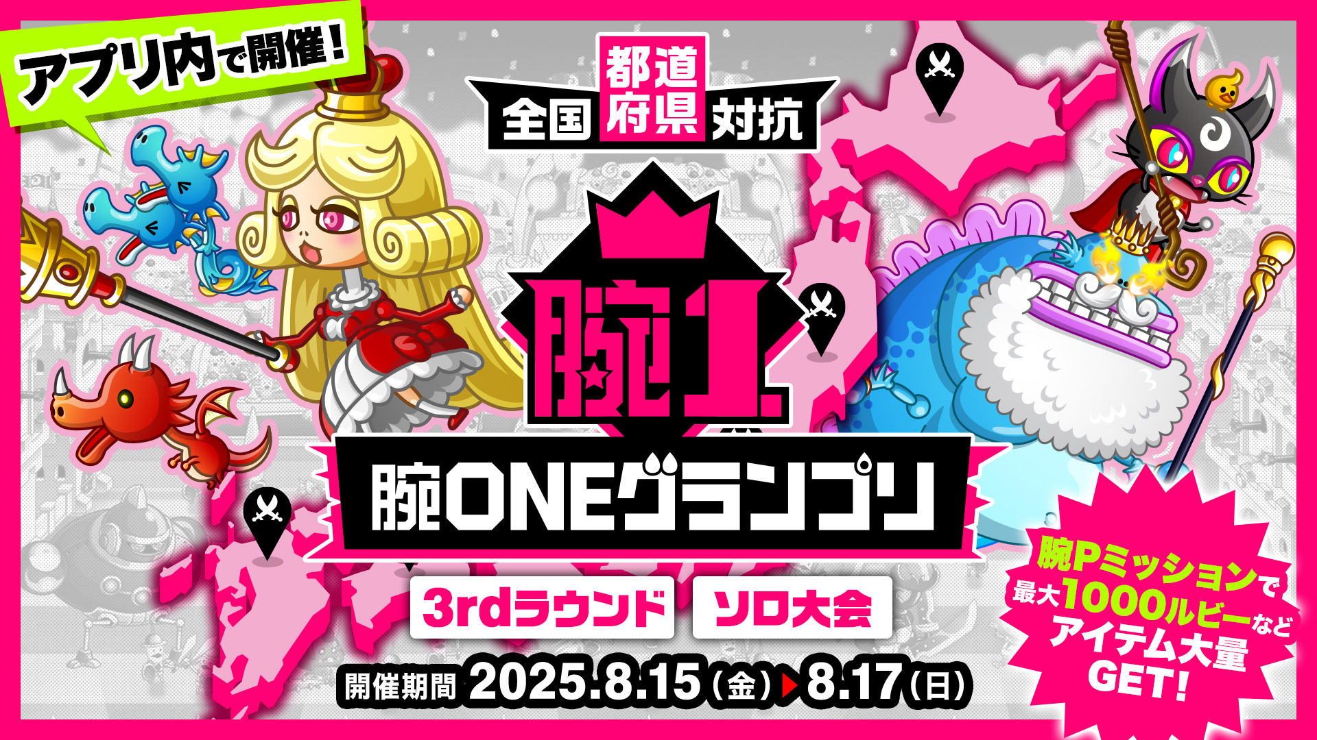 2025年8月15日(金)6:00より、「全国都道府県対抗腕ONEグランプリ 予選3rdラウンド[ソロ大会]」をアプリ内で開催いたします。予選は全『城ドラ』ユーザーが参加可能!今回はアプリ内で現在お住いの都道府県を自己申告し、バトルに挑んでいただく形となります。上級者VS初心者でも選択できるキャラ数や育成による差がなく戦える“腕ONEグランプリ”モードでのバトル。挑むほど達成でき、最大1,000ルビーや育成アイテムなど報酬がたっぷりもらえる「腕Pミッション」も同時開催!みなさまのご参加をお待ちしております。