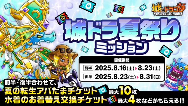 暑い夏を彩る「城ドラ夏祭りミッション」などのイベントを開催!ミッションは8月16日(土)0:00より開催の「前半」と、23日(土)19:00開催の「後半」で分かれており、「夏の転生アバたまチケット」や「水着のお着替え交換チケット」などが獲得できます。さらに最大1,200ルビーが獲得できる「城ドラ夏祭りログインボーナス」や、バッジコインが最大2,500枚もらえる「8月アイテムミッション(バッジ)」も併催!熱い夏を『城ドラ』と共に楽しみ尽くしましょう!