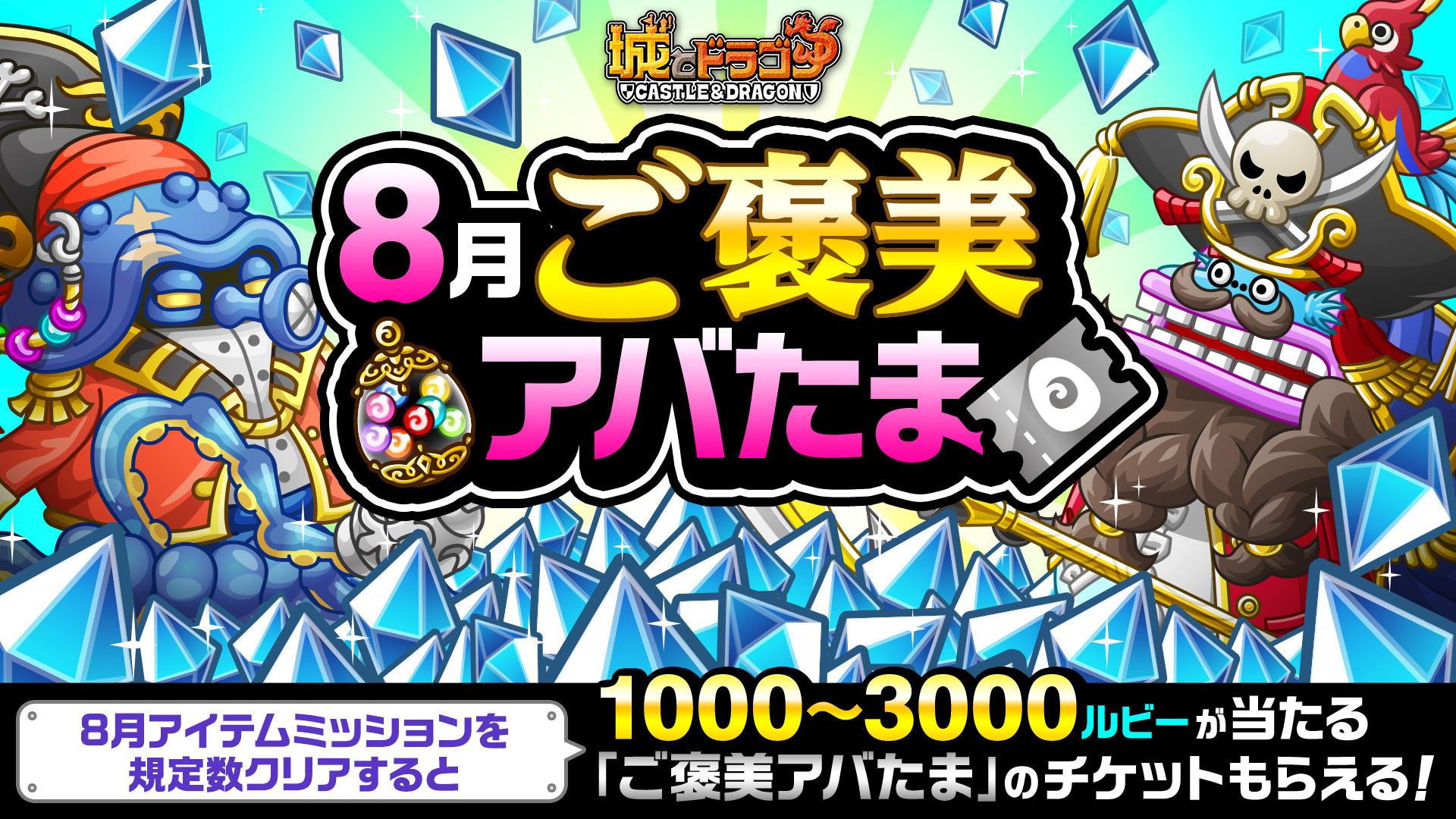 「8月アイテムミッション」を規定数クリアすると、「8月ルビーミッション」にて1,000~3,000ルビーが当たる「ご褒美アバたま」への挑戦できる“8月ご褒美アバたまチケット”1枚を獲得可能!さらにすべてのミッションをクリアすれば最大1,500ルビーが獲得できます!すべての報酬獲得を目指して、どんどん挑戦しましょう!