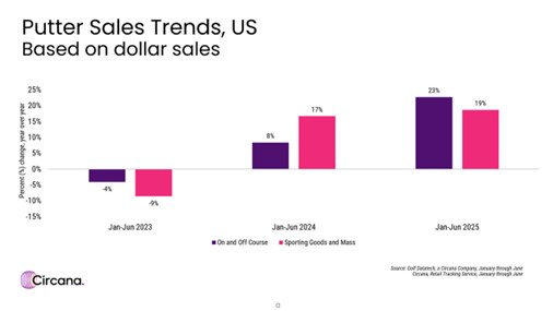 米国ゴルフ用品業界における2025年注目の話題は、ゴルファーのバッグの中で控えめで、しばしば見過ごされがちなギア、つまり「パター」にあります。Circana傘下のGolf Datatechによると、ゴルフ専門店およびゴルフコース併設店におけるパターの売上高は、2025年1~6月までの期間で前年同期比23%増加しました。さらにCircanaの小売トラッキングデータによれば、量販店やスポーツ用品店でもパターの売上が伸びており、同期間で19%の増加を記録しています。これらの数字を他のクラブカテゴリーと比較すると、今年に入ってから二桁成長を遂げているのはパターだけです。