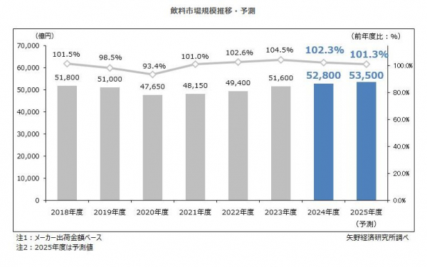 そのようなことから、価格改定の影響で販売数量が減少する可能性がある一方、単価再上昇により2025年度の飲料市場規模は前年度比101.3%の5兆3,500億円になると予測する。猛暑による販売押上効果は限定的にとどまるものと見込む。