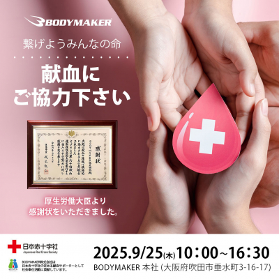 2025年9月25日(木)10時~16時30分(休憩時間:12時30分~13時30分)BODYMAKERは献血活動を行います。