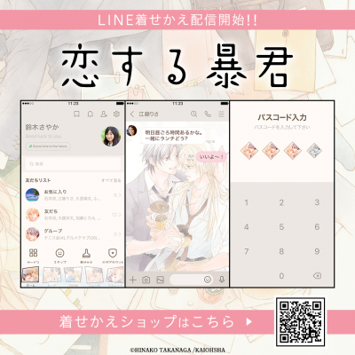 海王社×株式会社インクルーズが贈るLINE着せかえ最新作は、デビュー30周年を迎えた高永ひなこ先生のGUSH COMICS「恋する暴君」です。是非LINE着せかえでも「恋する暴君」の世界観をお楽しみください。