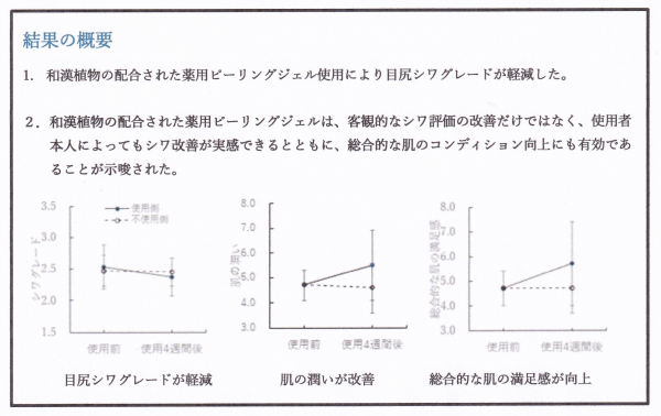 そこで、当社は、薬用有効成分である水溶性プラセンタエキスをはじめ、和漢植物の配合された薬用ピーリングジェルの効果についてハーフフェイス法を用い、目尻のシワに対する効果の検証を行いました。