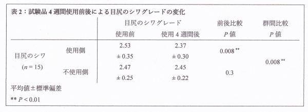 臨床試験4週間後における試験品使用側と不使用側の目尻のシワの変化についてそれぞれ解析したところ、試験品使用側ではシワグレードの減少が観測された一方で、 不使用側の目尻におけるシワグレードの減少は観測されなかった(図1、表2)。使用側と不使用側のシワの変化についての群間比較をからは統計的有意(P < 0.01)な差異が認められたことから、本試験品の4週間の使用によって目尻のシワが改善されることが明らかとなった。