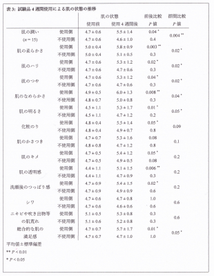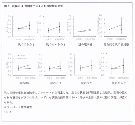 シワ軽減以外の、試験品の効果を調べるために、検査 4 週間前後における肌のコンディションについて被験者にアンケートを行った。多くの項目で試験品使用前後の得点に統計的有意な差異が認められた。特に、「肌の柔らかさ」「肌のなめらかさ」「肌の透明感」の項目ではP < 0.01の顕著な統計的有意差が示された。また、試験品使用側と不使用側の群間比較からも、「総合的な肌の満足感」をはじめとしてた多くの項目で統計的有意差(P < 0.05)が認められたが、なかでも「肌の潤い」に関しては顕著な統計的有意差(P < 0.01)が認められた。(図2、表3)。