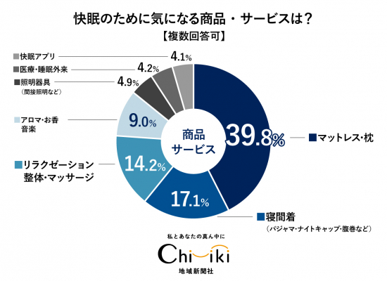 「快眠のために気になる商品・サービスは?」という質問に対して最も多かった回答は「マットレス・枕」で39.8%、次点は「寝間着」で17.1%でした。「リラクゼーション・整体・マッサージ」14.2%、「医療・睡眠外来」4.2%などサービス系の回答もありましたが、どちらかというと少数派です。手軽に試すことができる商品の人気が高く、「マットレス・枕」「寝間着」「アロマ・お香・音楽」を合わせると約60%を超えます。