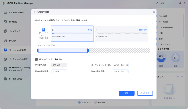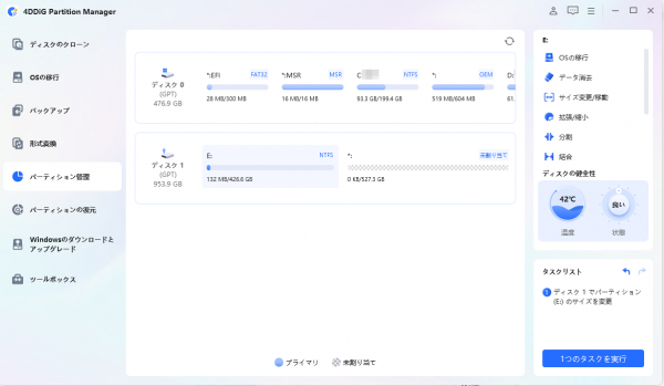 では実際に、「4DDiG Partition Manager」を使ってパーティションのサイズを変更する方法を見ていきましょう。