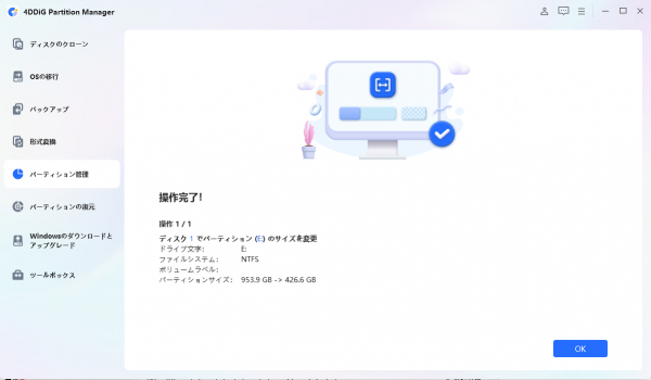 手順4.パーティションのサイズ変更プロセスがすぐに開始され、しばらく時間がかかります。パーティションのサイズが期待通りに調整されるまで待ち、「OK」をクリックしてください。