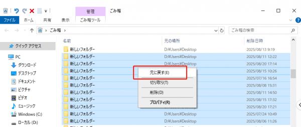 3.対象のフォルダを右クリックし、「元に戻す」を選択