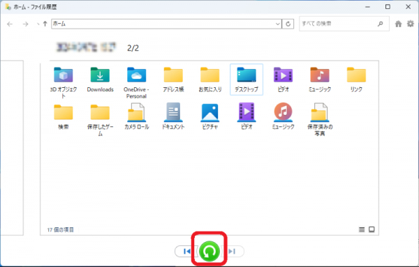 3.表示された画面で、画面下部の左右にある矢印をクリックして、復元したいフォルダが存在した過去の日時までさかのぼります。