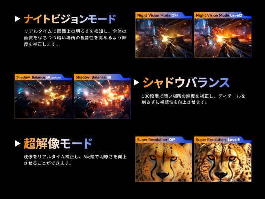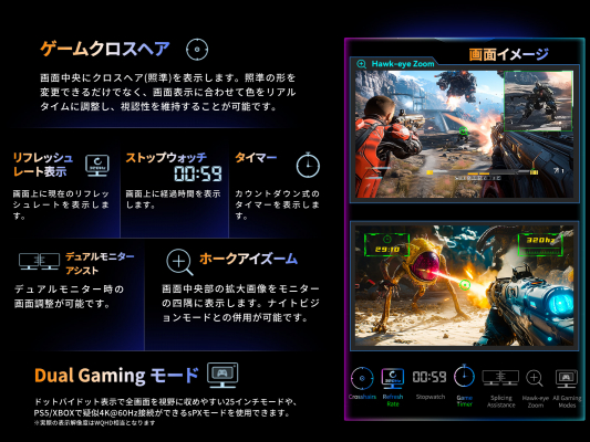 明暗のディテールを強調し、さらに鮮やかな映像を楽しめるHDR機能をはじめ、ゲームプレイやグラフィックを最大限に楽しむための支援機能を多数搭載しています。