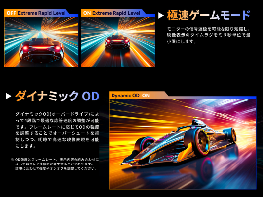 高精細なWQHD(2560×1440)解像度で最大200Hz動作に対応し、ゲームカテゴリやプレイスタイルに応じて美麗なグラフィックスと俊敏なレスポンスそれぞれを発揮することが可能です。高い応答速度により残像感を抑え、フレームレートの変動による表示の乱れ(ティアリング・スタッタリング)を防止するAdaptive Syncにも対応しています。