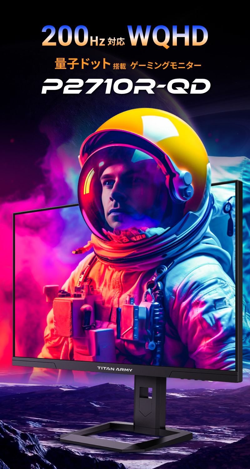 Titan Army P2710R-QDは量子ドット技術を搭載した27型200Hz対応のゲーミングモニターです。WQHD(2560×1440)の高解像度とDCI-P3 99%、Adobe RGB 99%の広色域に対応します。HDMI 2.0ポートを2つ備え、最新の家庭用ゲーム機においてWQHDでのプレイ、VRR(可変リフレッシュレート機能)にも対応しています。また、ダイナミックOD(オーバードライブ)機能により高リフレッシュレート時の残像感、ブレを低減し明瞭な表現を楽しめます。