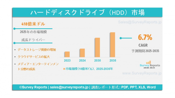 Survey Reports LLC は、2025年8月に 「ハードディスクドライブ(HDD)市場のセグメンテーション:タイプ別(内蔵HDDおよび外付けHDD)、記憶容量別(1TB未満および1TB以上)、用途別(モバイル、コンシューマー、デスクトップ、エンタープライズ、ニアラインその他) ― 世界市場分析、動向、機会および予測(2025年~2035年)」 という調査報告書を発表したと公表した。この報告書はハードディスクドライブ(HDD)市場の予測評価を提供するものであり、成長要因、市場機会、課題および脅威など、同市場に関する主要な市場ダイナミクスを強調している。