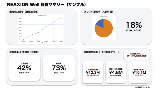 ● 支援内容:運用設計ワークショップ、管理者研修、効果検証テンプレート。同梱のREAXION Well経営レポートで合意形成と横展開を加速。