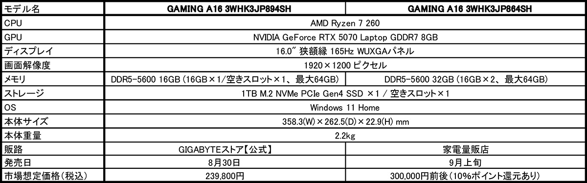 2025年8月29日 - GIGABYTE Technology Co., Ltd. 台湾・新北市 - コンピュータテクノロジーで世界をリードするGIGABYTE Technologyは、AMDの最新ノートPC用プロセッサであるAMD Ryzen 7 260と、NVIDIAの最新GPUであるNVIDIA GeForce RTX 5070 Laptop GPUを搭載した、エントリー向け16.0型AIゲーミングノートPC「GAMING A16シリーズ」2モデルを家電量販店(ソフマップ、ビックカメラ、ヨドバシカメラ)およびGIGABYTEノートPC直販サイト「GIGABYTEストア【公式】」を通して8月30日より順次販売を開始いたします。