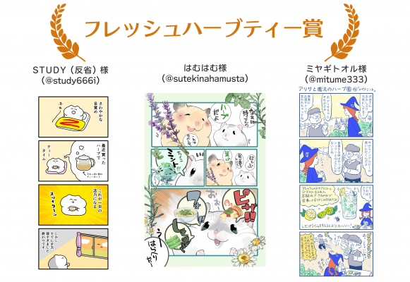 今回は8月2日の「ハーブの日」に合わせての開催となり、ハーブをテーマにした作品が多彩な切り口で表現され、大変見応えのあるコンテストとなりました。皆様のご作品を通して、ハーブの奥深さや魅力を改めて実感する機会となったとともに、多くの方にその魅力が届いたことを大変嬉しく思っております。本企画をきっかけに、「ハーブの日」がより広く認知され、日々の暮らしの中にハーブが取り入れられるきっかけとなりましたら幸いです。SNSマンガ大賞は今後も定期開催していく予定ですので、是非これからもご参加頂ければと思います。