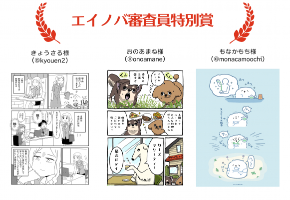 ご応募頂いた中で惜しくも最優秀作品賞には至らなかったものの、審査員より高く評価された方々へ、エイノバ審査員特別賞を授与させていただきます。当初は1名様のみの選出を予定しておりましたが、予想を上回る多くの魅力的なご投稿をいただいたことを受け、今回は特別に3名様を選出いたしました。