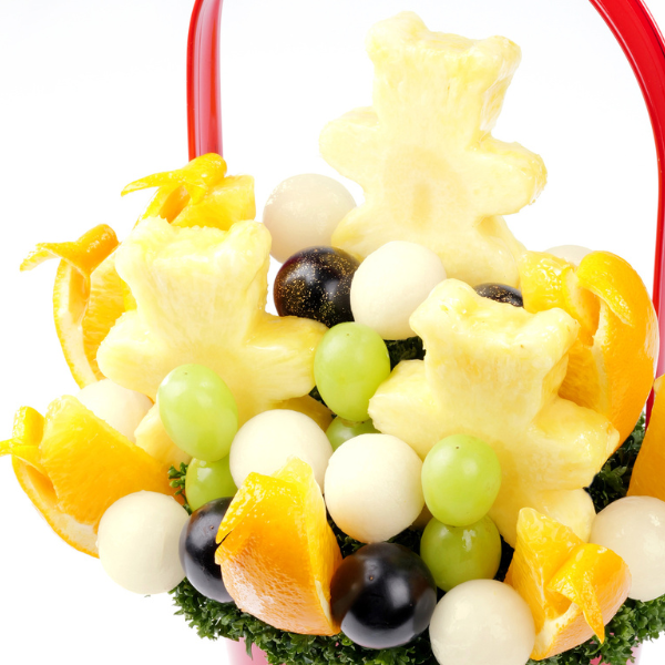 くまさん型のパイナップルと丸くくり抜かれた旬の梨を中心に、シャインマスカット・巨峰・オレンジなど秋の恵みをふんだんにアレンジ。