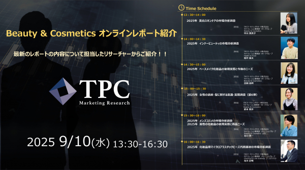 リサ・リューション事業を展開するTPCマーケティングリサーチ株式会社(代表取締役社長:松本 竜馬)は、2025年9月10日にBeauty & Cosmeticsオンラインレポート紹介を開催いたします。