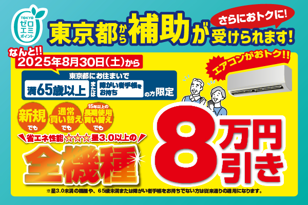 株式会社ノジマ(神奈川県横浜市、代表執行役社長・野島廣司)では、省エネ性能の高い家電製品にお買い替え(または新規購入)される都民の方に、東京ゼロエミポイントとして購入金額の一部を割引するキャンペーンを実施しております。このたび8月30日(土)より、満65歳以上の方または障がい者手帳をお持ちの方を対象に、エアコンご購入の支援額が8万円となることが発表されました。