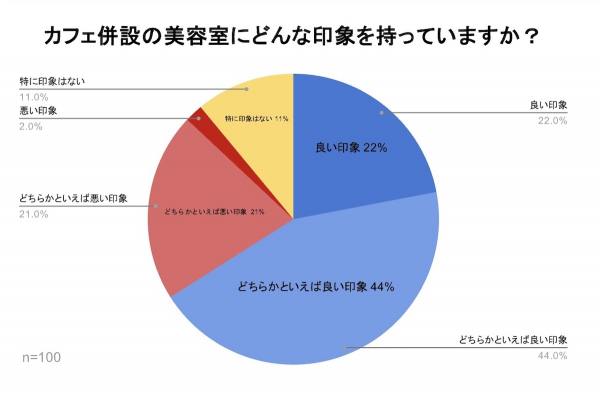 「カフェ併設の美容室にどんな印象を持っていますか? 」の質問では、『良い印象』が22%、『どちらかといえば良い印象』が44%、『どちらかといえば悪い印象』が21%、『悪い印象』が2%、『特に印象はない』が11%という結果となりました。