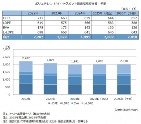 2025年のPE出荷量(メーカー出荷量ベース、輸出分含む)は前年比100.9%の200万9,000tになる見込みである。