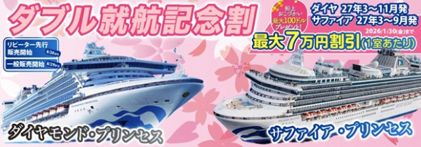 毎度おなじみのダイヤモンド・プリンセスに加えて、なんと姉妹船 「サファイア・プリンセス」が2027年から日本発着クルーズに登場いたします!2026年1月31日までのご予約で「W就航記念割」が適用され、初めてのお客様でも通常料金に比べ大変お得にご予約いただけます。なんと「海側バルコニーの3-4名目が無料」となります。お子様の3-4名様目が無料という料金形態は珍しくはないですが、今回は「おとな」にも適用されます!ぜひこの機会にお得にプリンセスクルーズに乗船してみませんか?