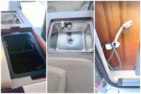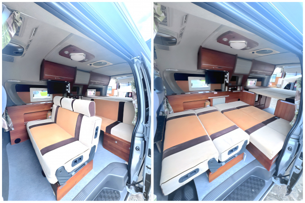 ハイルーフの余裕ある室内高と、ナッツRVならではの巧みな家具設計により、バンコンでありながら圧迫感の少ない、明るく広々としたインテリアを実現。ギャレー(キッチン)には大きめのシンクや冷蔵庫が備えられ、長期の旅行にも対応できる実用性を確保していました。